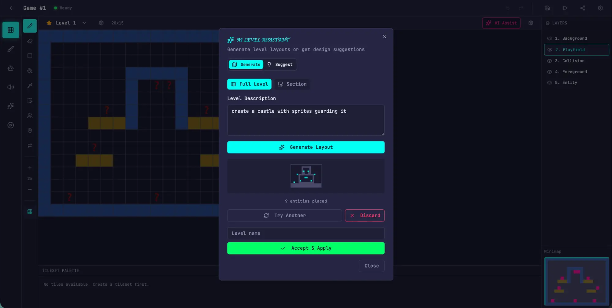 这款应用立刻展现出比单独运行更高的完成度与流畅度。画布使用了完整的视口,面板的尺寸设计得很合理,并且界面拥有与说明书中的设计方向一致的统一视觉形象。我在单独运行中看到的一些笨拙感确实保留了下来——工作流程仍然没有弄清楚你应该在尝试填充关卡之前构建精灵和实体,我不得不通过到处乱点才弄明白这一点。这被解读为基础模型产品直觉上的空白,而不是支架设计要解决的问题,尽管这确实表明在支架内部进行有针对性的迭代可以帮助进一步提高输出质量。